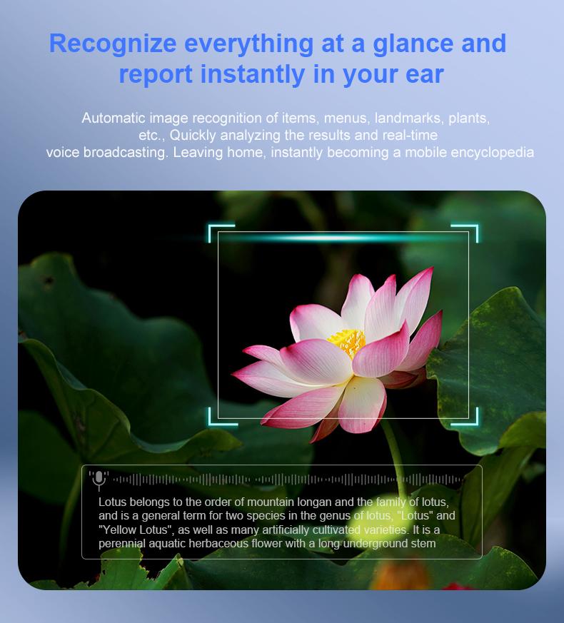 ●【Recognize items】: Automatic image recognition of items, menus, landmarks, plants, etc., Quickly analyzing the results and real-time voice broadcasting. Leaving home, instantly becoming a mobile encyclopedia