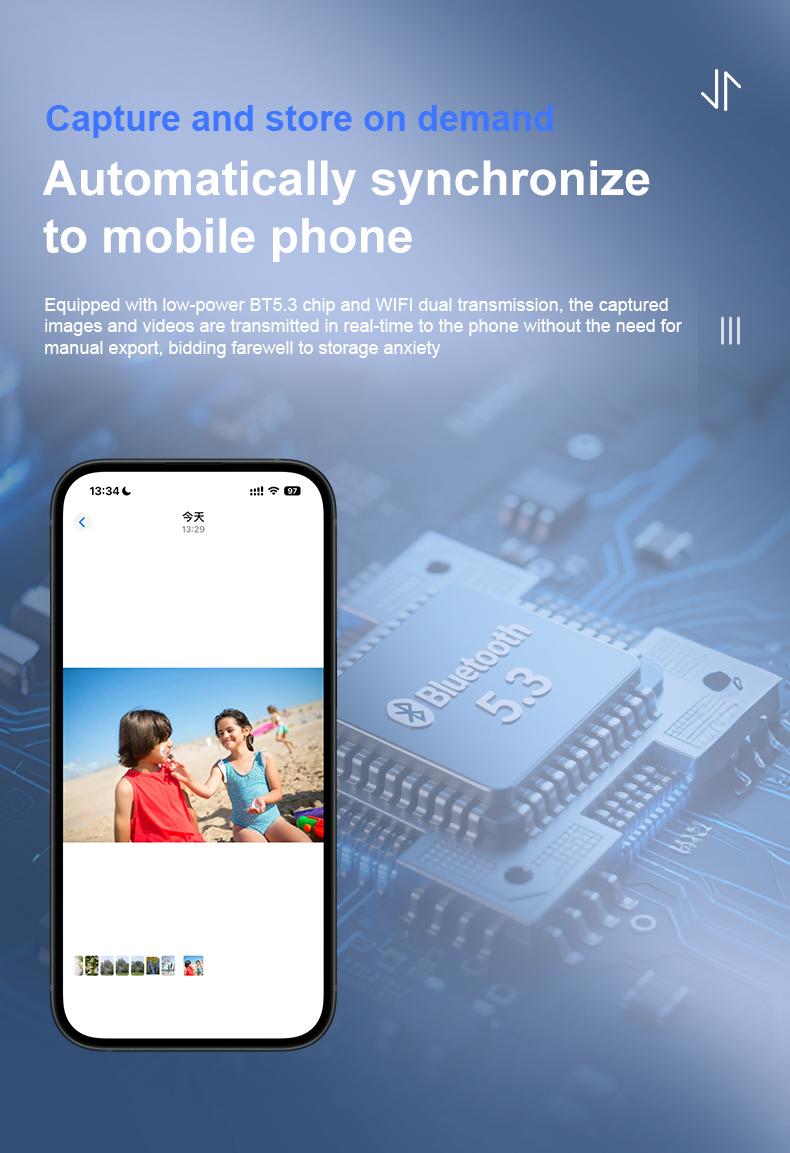 ●【Automatically synchronize to mobile phone】: Equipped with low-power BT5.3 chip and WIFI dual transmission, the captured images and videos are transmitted in real-time to the phone without the need for manual export, bidding farewell to storage anxiety.