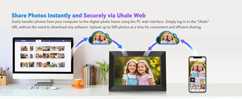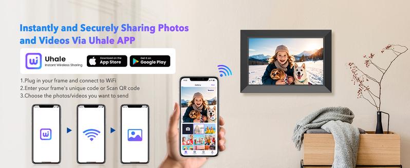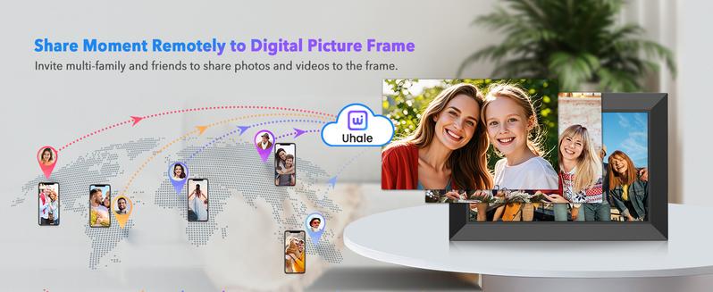 【Sharing Photos/Videos Privately and Securely via Fr-ee "Uhale" APP 】Capture every moment and instantly share it with your loved ones. Connect the digital picture frame to your home WiFi, download the "Uhale" App on your phone (available for Android or iOS), and send photos/videos to the Uhale digital picture frame from anywhere in the world.