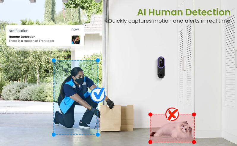 Wireless Video Doorbell Camera, Smart Security Doorbell Camera, 1080P, AI Human Detection , Night Vision, Instant Alert, Two Way Audio, Simple Installation and Rechargeable Battery, Cloud Storage, Wifi Camera